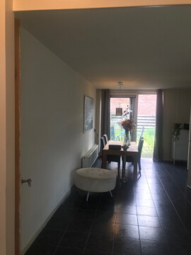 Bij binnenkomst na de tuin stapt u in de hal. Deze biedt toegang tot de meterkast en woonkamer. In deze hal, vroeger het tochtportaal van de woning, heeft u genoeg ruimte voor de jassengarderobe. De antracieten tegels zijn in de hal, woonkamer en keuken gelegd. Hierdoor vormen de verschillende ruimtes 1 geheel. De woonkamer van 30 m2 heeft een spelende vorm waardoor er een voor en achter ontstaat. Deze is voorzien van een mooie houtentafel (met stoelen),lampen een slaapbank, een poef, een stoel en en een dressoir. Gordijnen zijn ook aanwezig. Beide kanten hebben genoeg lichtinval en de zonnige achtertuin is te betreden via een mooie schuifpui. De keuken is voorzien van een vaatwasser, koelkast, oven, magnetron, gasfornuis, afzuigkap en spoelbak. De tegels (zogenaamde metro look) tegen de achterwand maken het mooi af.