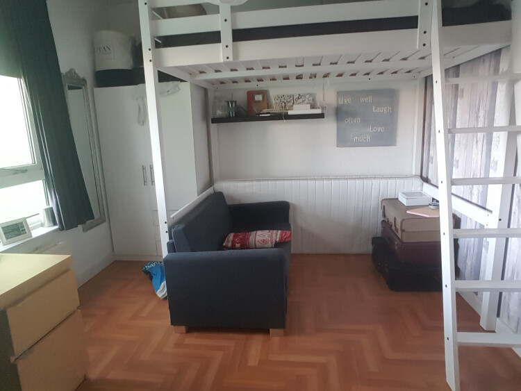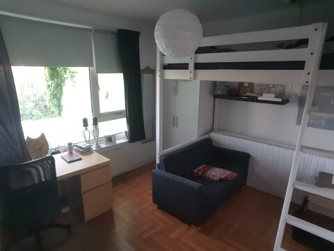 De 1e kamer is 13 m2 en is gelegen op de begane grond, met een groot raam waar veel lichtinval is. De kamer kost €335,- euro per maand inclusief. Het is mogelijk om de hoogslaper, kast en bank over te nemen.