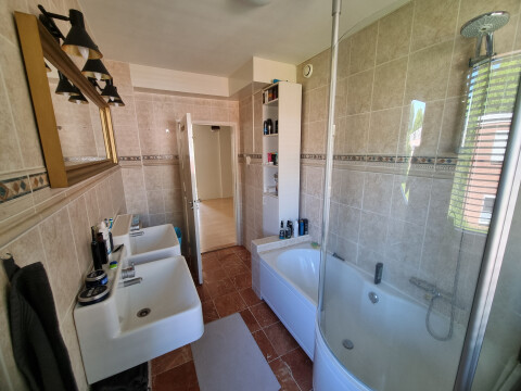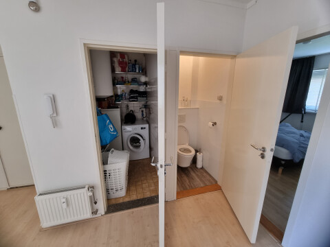 Ruimte eet-woonkamer, douche met bad, ruime hal en eigen berging en openbare fietsenstalling beneden.