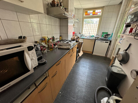 De kamer bevindt zich op de eerste verdieping van het huis. Bij binnenkomst kom je in de hal, waar de trap naar boven leidt. Via deze trap krijg je toegang tot alle kamers en de gemeenschappelijke ruimtes. De kamer zelf is ruim en beschikt over een eigen wastafel en twee ingebouwde kasten. De keuken en het balkon deel je met 3 huisgenoten en de douche met 2 huisgenoten.