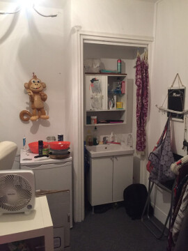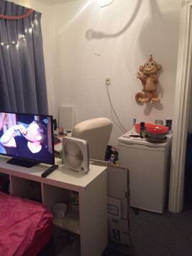 De kamer (12m2, €300 p.m) bevindt zich in een oud klooster. In het huis woon je met 33 andere mensen. Badkamer, toilet en keuken deel je met anderen. Op elke gang in het huis heb je wc's en badkamers.
