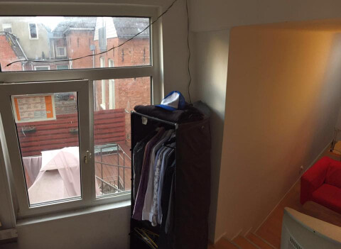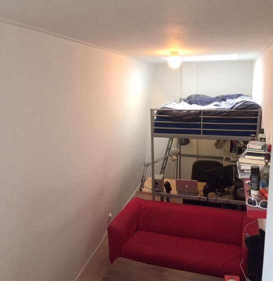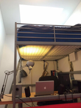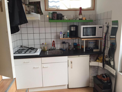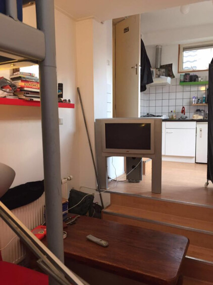 De kamer is 20 m2 en heeft een eigen keuken. Er is veel lichtinval door een groot dak- en zijraam. Verder is er ook een gemeenschappelijke keuken. Voor de rest worden de 2 wc’s en 2 douches gedeeld met de andere huisgenoten. De kamer kost €435,- per maand inclusief. Daar komt nog €7,50 voor het Internet, de vaatwasser en wasmachine bovenop.